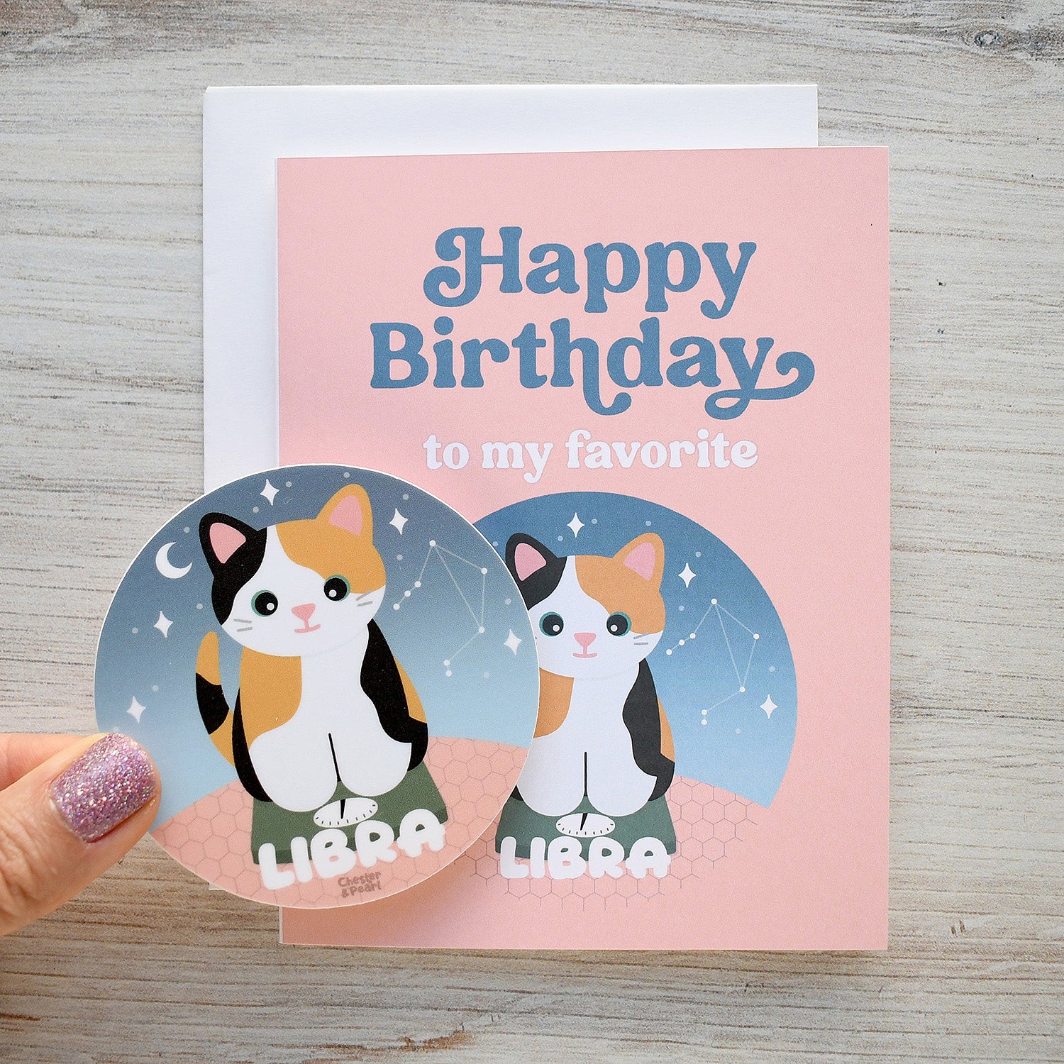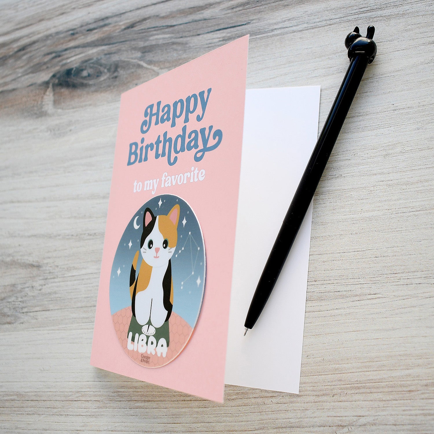 This Zodicat birthday card for your favorite Libra includes a removable 3" waterproof vinyl sticker that the recipient can place on a water bottle, laptop, tablet, car, notebook, or anywhere else they want to add a touch of cosmic kitty cuteness! The card is blank inside for you to add your own personal note.