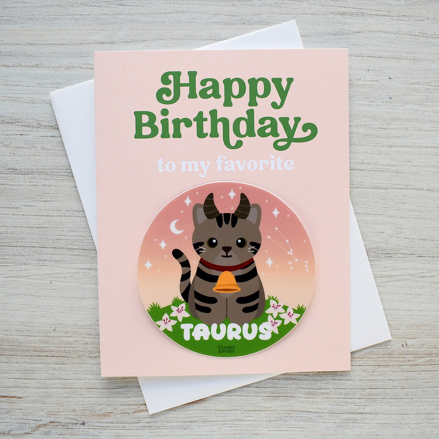 This Zodicat birthday card for your favorite Taurus includes a removable 3" waterproof vinyl sticker that the recipient can place on a water bottle, laptop, tablet, car, notebook, or anywhere else they want to add a touch of cosmic kitty cuteness! The card is blank inside for you to add your own personal note.