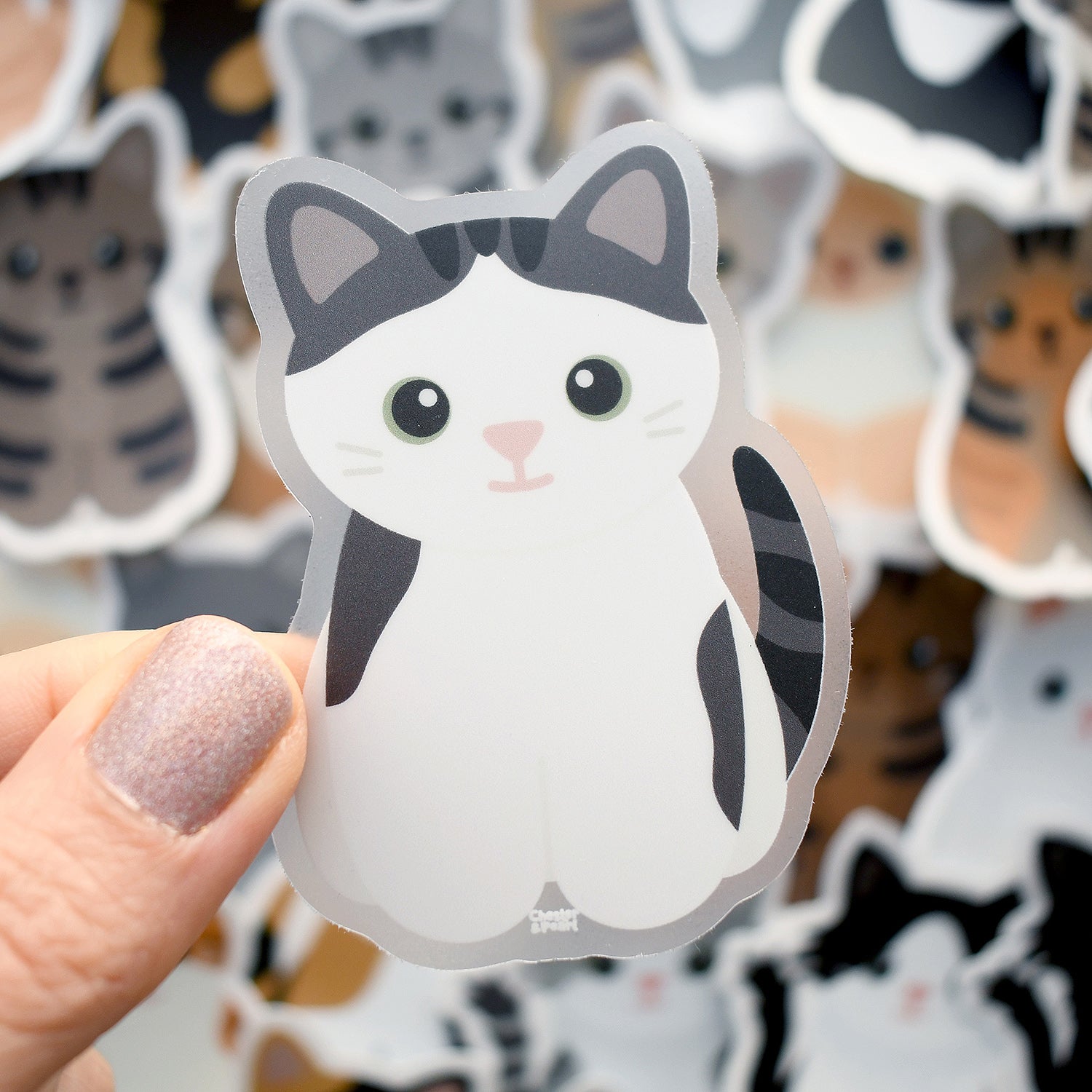 Bring a cute reminder of your kitty with your everywhere with a thick, durable vinyl gray and white cat sticker!
