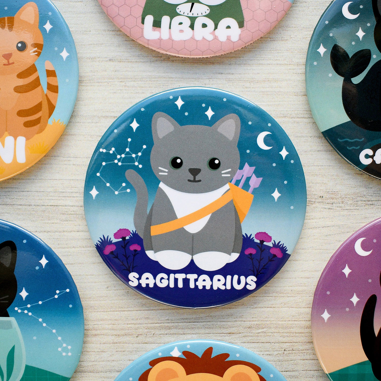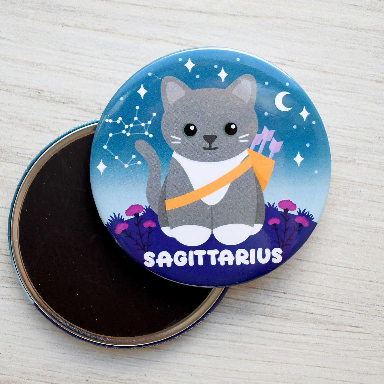 On this Zodicat fridge magnet, a cute Sagittarius cat plays archer in a lawn of carnations beneath a starlit sky dotted with its zodiac constellation.