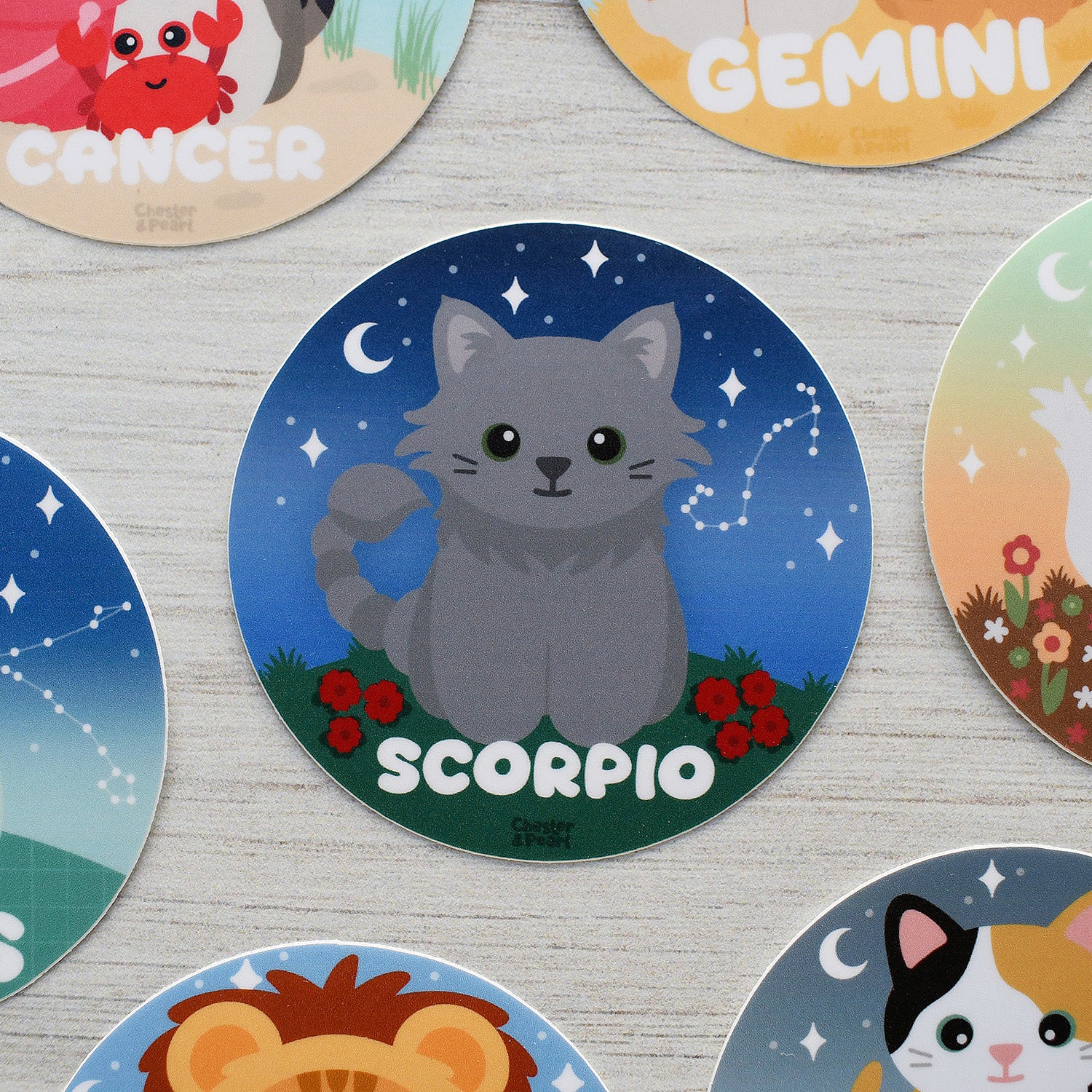 On this Zodicat sticker, a cute Scorpio cat plays scorpion in a lawn of geraniums beneath a starlit sky dotted with its zodiac constellation.